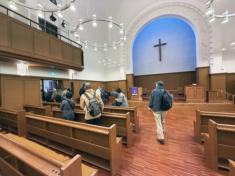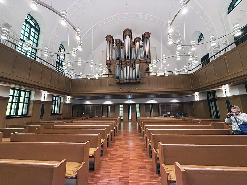同じく竹中工務店施工の神戸栄光教会は、阪神大震災で倒壊したものを復元し、景観形成建築物となっているそうです。外観の煉瓦積みとともに、私には内部の照明が印象的でした。 すぐ横に目をやると登録有形文化財の兵庫県公館、そして今後解体が予定されている兵庫県庁舎があります。耐震基準に満たないという事情があるとはいえ、この雰囲気のある県庁舎がなくなってしまうのは残念ですね。ただ、建て替えの間仕事の場を兵庫県公館に移される県職員の方は羨ましいような気がします。