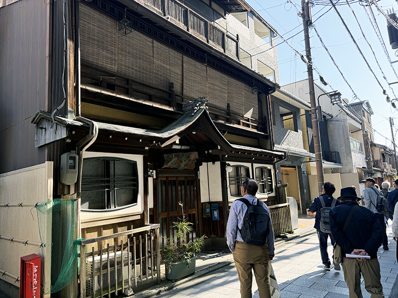 11月の見学会は秋の行楽日和となりました。今回は当会の運営委員で建築士の牧さんの案内です。集合場所は吉例顔見世興行で有名な南座です。京阪電車四条駅から地上に出ると南座のすぐ前です。南座の西側に歌舞伎の創始者といわれる出雲阿国(いずものおくに)が、かぶき踊りをこの地で始めたことを記念した「阿国歌舞伎発祥地の碑」があります。