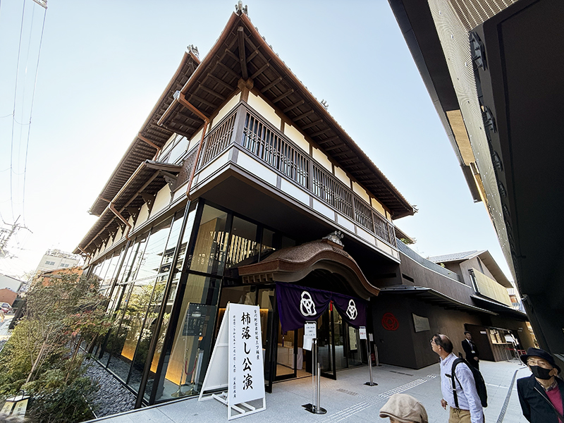 南座の外観は和風ですが、1929年にそれまでの木造から鉄骨鉄筋コンクリート造地上4階地下1階建に建替えられ、その後2018年には大規模な耐震改修工事が竣工したそうです。かつて南座の四条通を挟んで北側には北座があったそうです。四条通の拡張に伴い取り壊され、現在は石柱があるのみです。近くにはレストラン菊水のレトロな洋風ビルが建っています。鴨川の西側には同じくヴォーリズ設計の東華菜館(中華料理)のレトロビルが建っています。四条大橋を渡り、東華菜館のすぐ西側の狭い道を南に歩いて行きます。少し歩いて鴨川に架かる団栗(どんぐり)橋を東に渡ります。宮川町通を歩くと京都らしい街並みが続きます。途中、東に曲がると真新しい宮川町歌舞練場があり、杮(こけら)落し公演の看板が出ていました。ちなみに、「杮落し」の杮(こけら)と柿(かき)の字は同じに見えますが違うそうです。