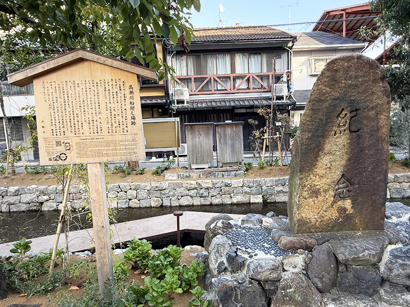 少し歩いて松原橋を渡り、鴨川の西側の木屋町通を南下します。通り沿いに高瀬川が流れています。高瀬川は角倉了以(すみのくら りょうい)・素庵(そあん)父子によって開削された運河です。森鴎外の短編小説「高瀬舟」は、遠島を申し渡された罪人を運ぶ船上で同心が、ことのいきさつを聞いてその罪状に疑問を抱くとともに安楽死について考えさせる内容です。