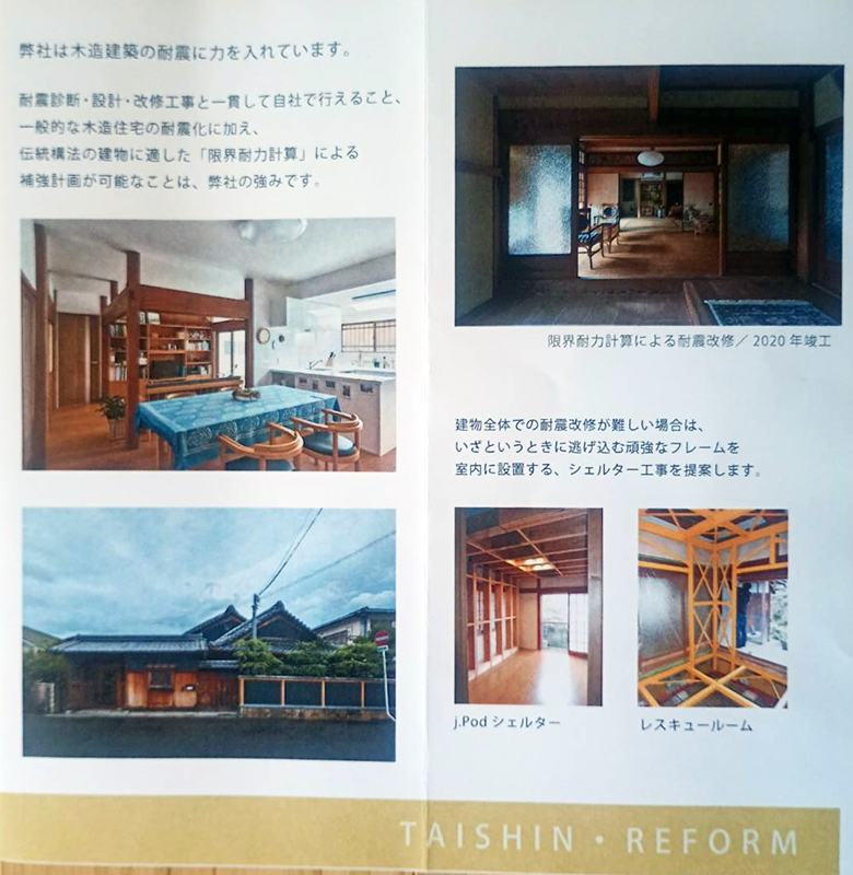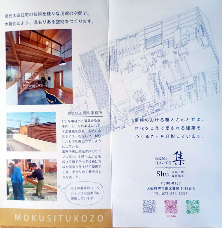 現在は、堺市南区高尾に会社を置き「新築・改修・耐震診断・耐震改修・木製家具等」の設計施工・家具工事も範疇です。木工家具は住まいに調和したデザインで造ることもあるそうです。