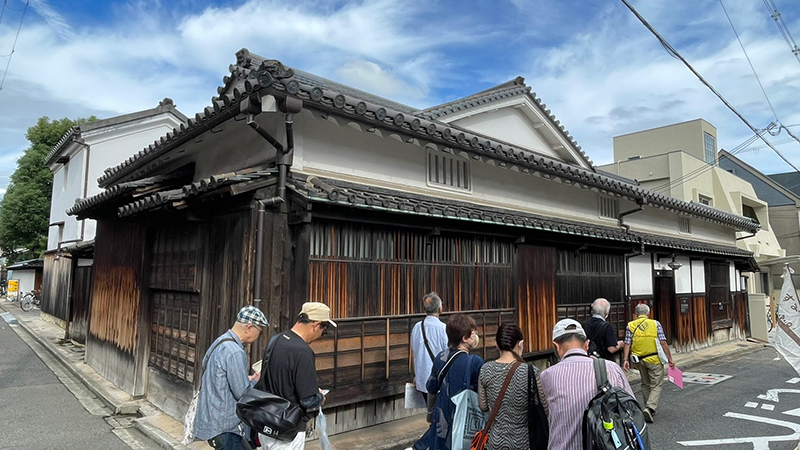 山口家住宅を出て、「堺まちなみ修景建物」(第二次世界大戦の戦火を免れた歴史的建築物が多く残る地域で、歴史的なまちなみを再生し、魅力向上を図るため、市民協働による取組)の建屋を外観から見て通り、 最終見学場所の2023年度弊会の座学で講師をされたエリック・シュバリエ氏の工房「DE SAKAI」へ。昭和初期に建てられた町家をリノベーションし、そこではエリックさん自身の鍛冶の実演見学でき、「この施設のいいところは、誰でも気軽に入れるようにしているところ。施設内をゆっくり楽しんでもらいたい」と自身が解説してくれました。また包丁の販売やワークショップなどにくわえ、工房を奥に進みますとフラワーショップ、フルーツパーラー、柳が涼やかな井戸水を汲み上げる人口池のある中庭、そしてその奥には一日一組限定の和風の宿泊施設が設えられています。