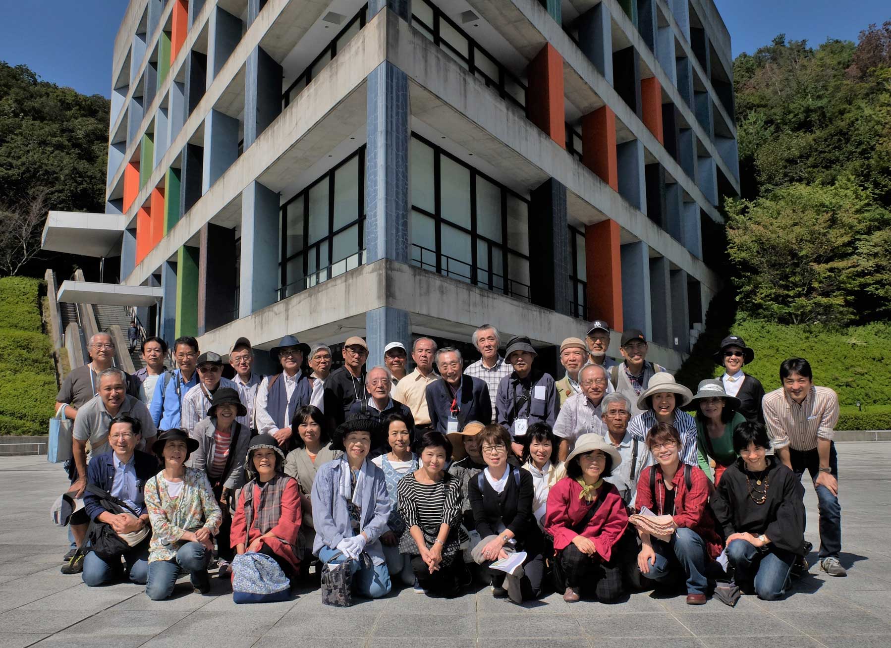 参拝を終えて宝塚大学に向かいました約20分。ル・コルビユジェの後継者建築家アンドレ・ボジャンスキーの設計で山の斜面を利用しての建築で迷いそうな感じでした。設計の時は相当な時間をかけ計画を進めたようです。案内人の牧さんから聞いていた「近代建築の五原則」