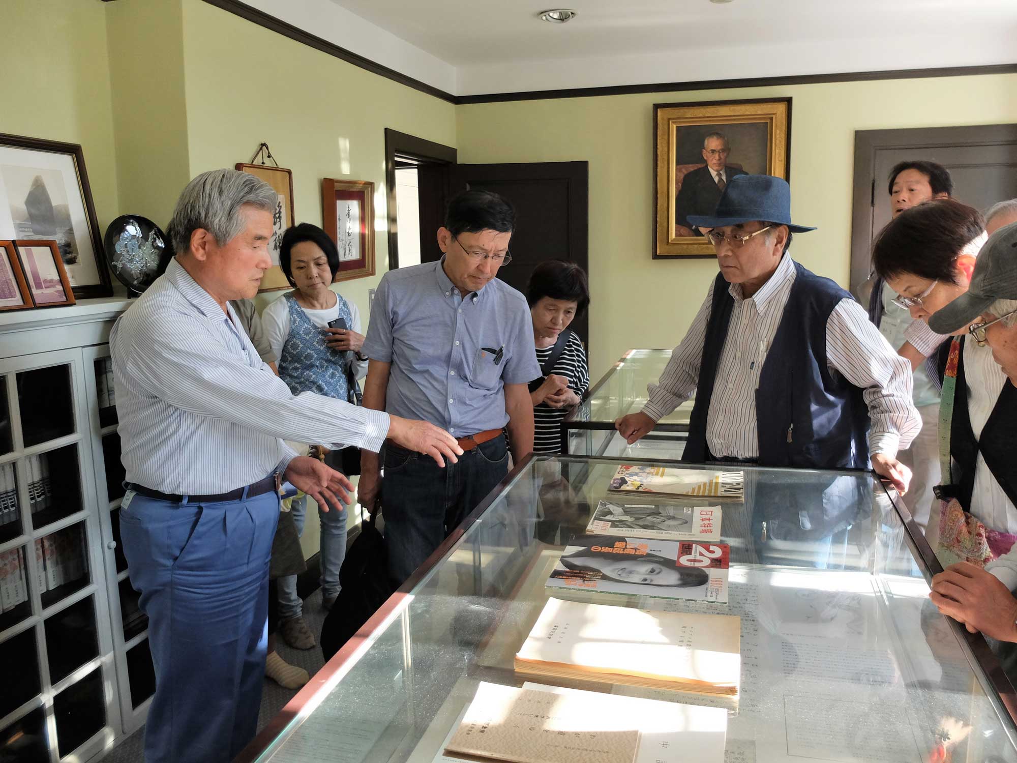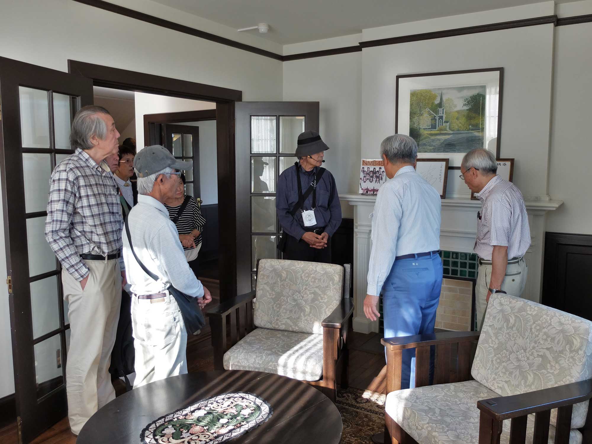 坂道をだらだらと下りながらの豪邸、旧家等々を見学しながら旧高崎邸(高崎記念館)に向かいました。W.M.ヴォーリズの設計で1923年(大正12年)旧諏訪邸として竣工しています。木造2階建てマンサード(腰折れ屋根)様式建築で開発当時の面影を残していました。2階には高崎達之助氏の功績を感じられる勲章、中国周恩来首相からの招待状等々が展示されていました。敷地面積1702.8u(約500坪)で庭も立派な庭でバラ、ヤシ等々たくさんの花が植えられていました。班別の見学で説明も3回していただきありがとうございました。